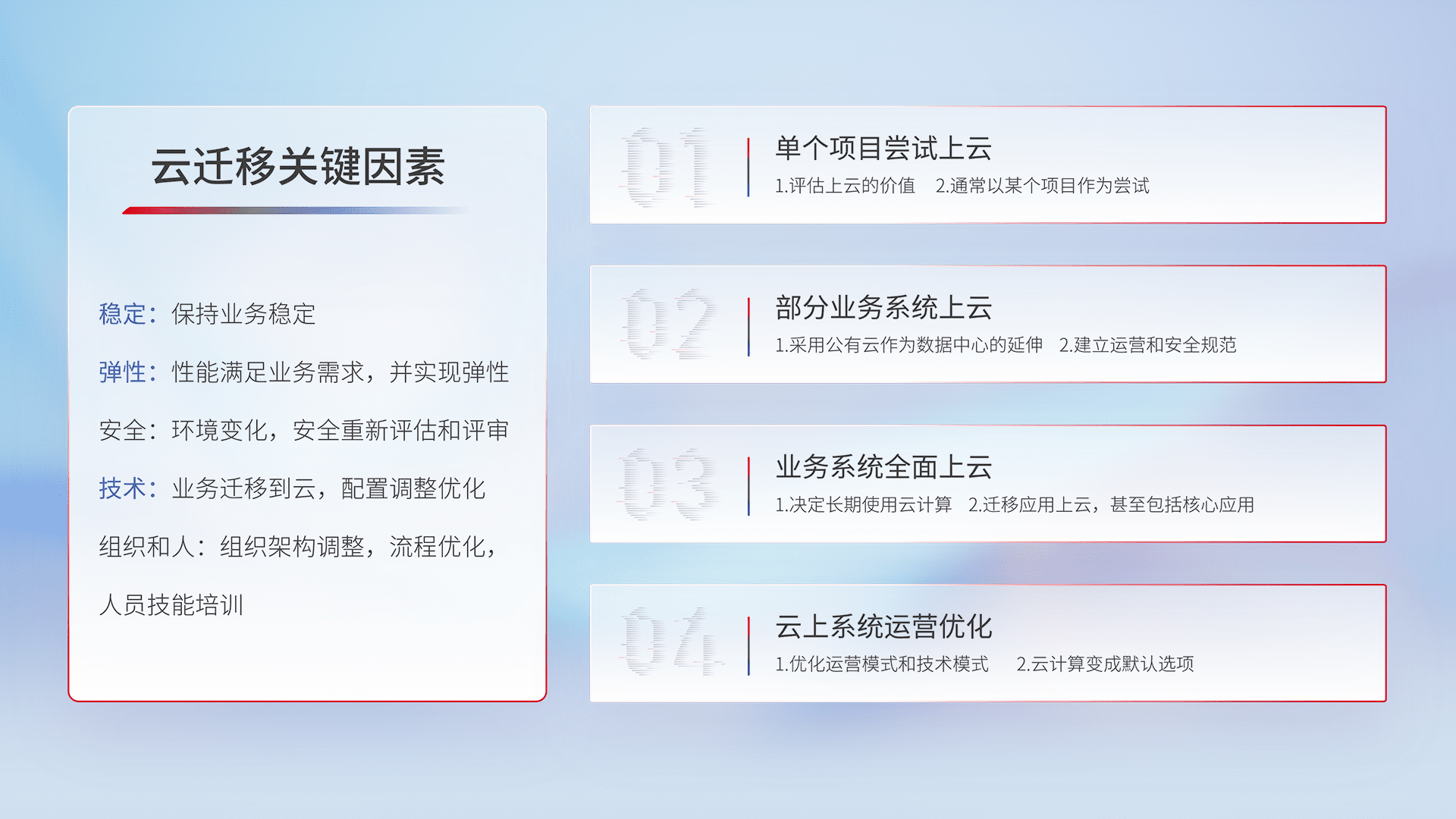 结合实际业务,,,从规划设计、、、、云平台选型、、、、云原生改造、、数据迁移、、集成交付,,迁移全过程为客户识别最佳上云路径,,做好风险识别管理,,,设计网络架构、、、身份权限、、、安全审计合规、、、、操作审计、、、日志审计、、、监控告警策略、、多站点容灾设计等,,,,对云上基础设施进行整体规划,,提升IT治理水平,,以满足弹性、、高可用、、高性能的需求。。